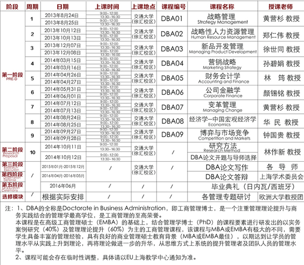 歐洲大學(European University)工商管理博士(DBA)是在高級工商管理碩士(EMBA)的基礎上,結合管理學博士(PhD)的課程要素進行研發出的以實務案例研究(40%)及管理理論提升(60%)為主的工商管理課程,該課程與MBA或EMBA有極大的不同,需要學生具備豐富的管理經驗,具有良好的商業管理碩士教育背景(MBA或EMBA最佳),以期達到讓學員的管理水準從實踐上升到理論,再將理論做進一步的昇華,從思維方式上系統的提升管理者及團隊人員的管理水準。