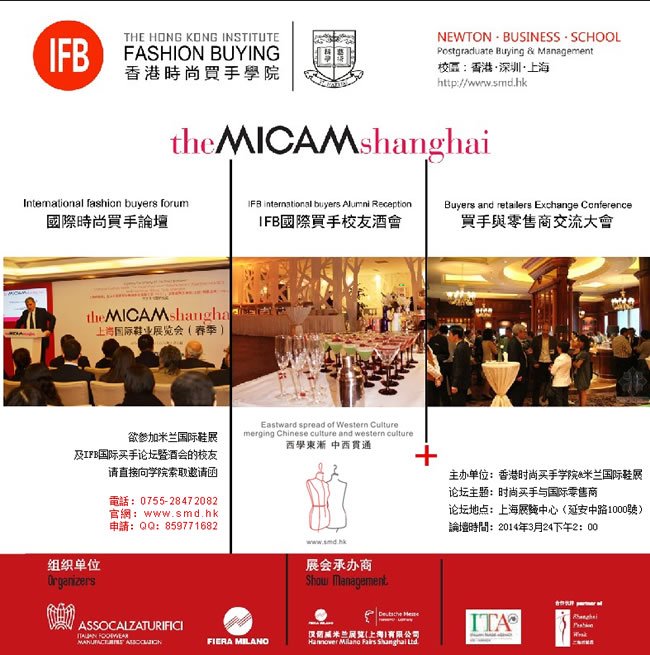 2014年3月24日義大利米蘭(the MICAM shanghai)鞋展將與全球三大時尚買手教育機構之一的香港時尚買手學院聯合舉辦國際買手論壇合作及時尚酒會,義大利米蘭國際鞋展(the MICAM)是歐洲以及全球影響力最大,檔次最高,規模最大的國際性專業鞋展,為世界三大鞋展之一。3月24日下午米蘭鞋展將與香港時尚買手學院聯合聘請香港時尚買手學院的國際買手與校友,舉辦國際時尚買手論壇。並且義大利米蘭國際鞋展協會成員將與香港時尚買手學院的校友舉行雞尾酒會,一起探討國際時尚買手運營模式與發展。
