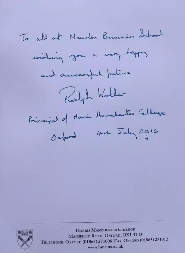 牛津大學執行校長拉爾夫•沃勒博士為牛頓商學院全體成員題字祝賀