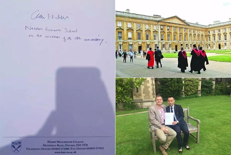 牛頓商學院執行院長吳波博士被牛津大學正式錄取為訪問學者,牛津大學校長親自簽發錄取通知書,在牛津大學做訪問學者,體驗牛津大學的古老的文化氛圍,領略了牛津大學各學院的不同學科特色,學習了國際化的創新管理課程,還與牛津大學拉爾夫•沃勒校長、牛津大學林肯學院院長Eric和牛津大學賽德商學院Alex教授結下了深厚的友誼。為牛頓商學院推行國際化的海外教育及中英名校的學術交流與合作奠定了堅實的的基礎!
