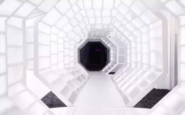 推開略微斑駁生銹的鐵門,裝修前原本便令人驚歎的室內空間,在 Gary Card 巧手重新設計下,展現全然不同的未來樣貌。如骨骼般貫穿、由木頭支架建構的幾何長廊,保留原有的框架,重新漆上白色與 LED 照燈,彷彿走進與世隔絕的太空艙隧道,象徵著 LN-CC 走進未來卻秉持始終如一的實驗精神。原本以長廊為中心延伸而出的數個房間,現在多增加了 reception 空間 Carpet Room,陳列少許單品與香氛;深淺不一的灰色方塊絲絨毛毯鋪滿牆面與地板,像是走進粉色低調版的皮特.蒙德里安畫作,給予來訪者溫柔如紳士的歡迎。