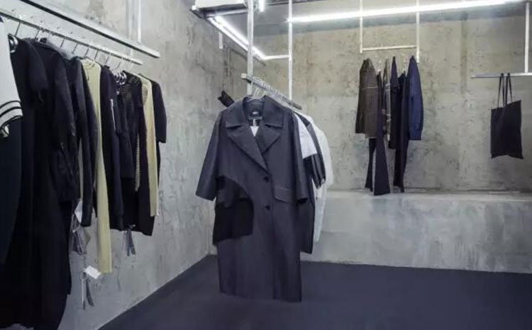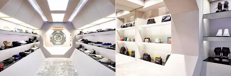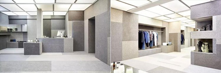 配件、飾品與鞋履擺放在對稱規矩的 Secular Room,底部的鏡面裝飾創造出無限延伸的豐富視覺。Mainline Room 原有的木頭裝置衣架,包覆上塑膠質感的石膏膠泥,地上鋪滿黑色玻璃瓶碎片,像是閃爍的深沉星光,凸顯女裝的繽紛色彩。男裝的 Grid Room 以斑駁花紋的水泥牆面與灰地,展現冷調工業氣質;從天花板懸掛而下、如格子般量身打造的吊杆,則花費焊工師傅三個禮拜才完成。