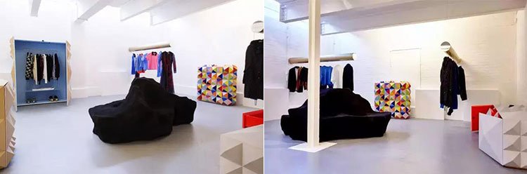 隔壁的 Gallery Room,邀請由設計師 Alberto Biagetti 與藝術家 Laura Baldassari 領導的 Atelier Biagetti 團隊打造。透過 I Diamanti 等衣櫃設計裝置作品,將衣服與商品以展覽方式做陳列,營造出濃厚的當代美術館氣息。