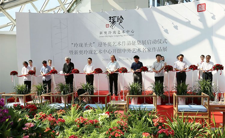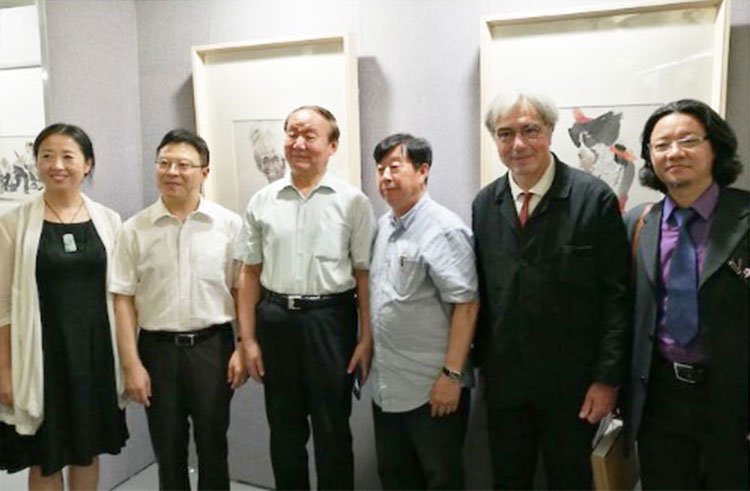 中國美術家協會主席劉大為,法國美術家協會主席雷米•艾融,中國著名美術史論家書畫家劉曦林,中法著名畫家馬澤霖等藝術家們在新奧玲瓏藝術中心內留影