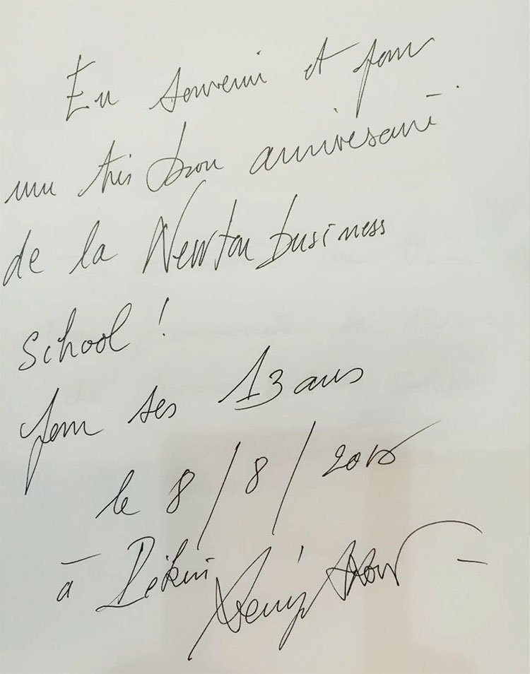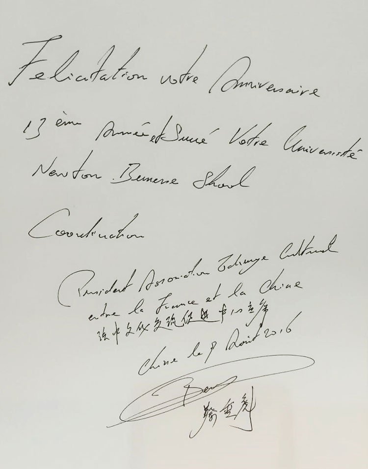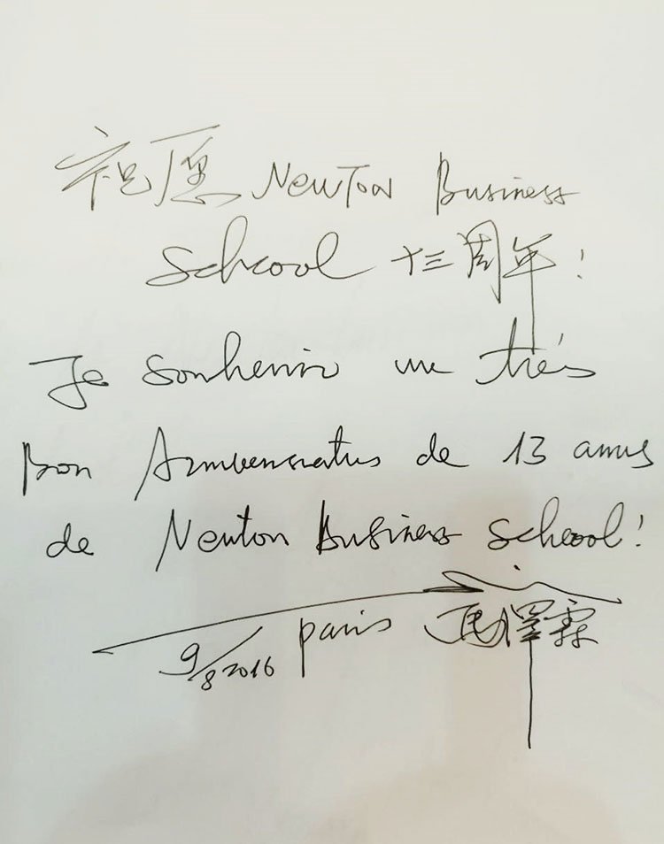 法國美術家協會主席雷米•艾融為牛頓商學院成立十三周年題詞祝賀