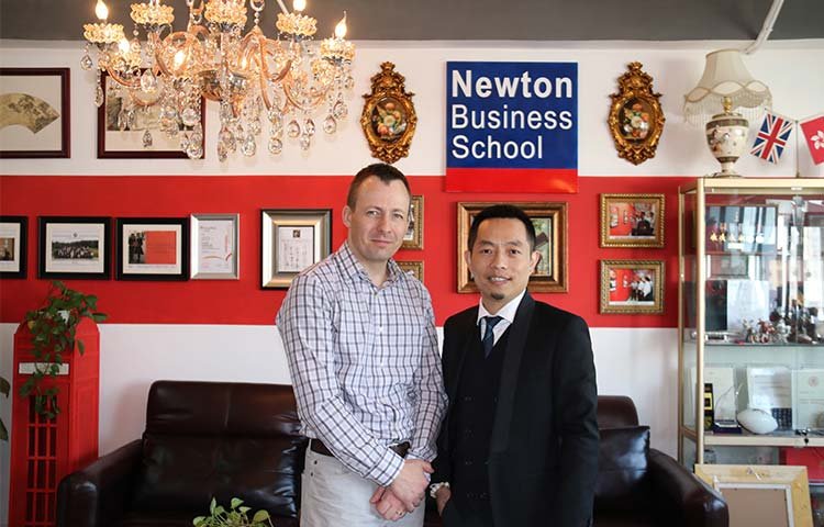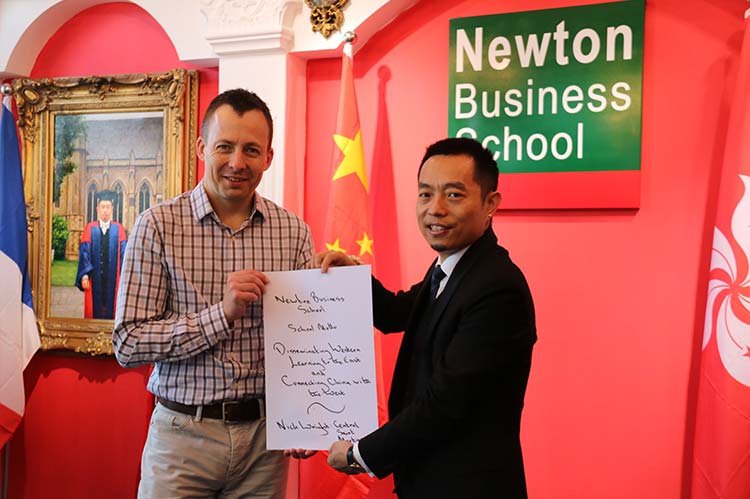 吳波博士向Nick Wrigh介紹牛頓商學院發展歷程及傑出校友