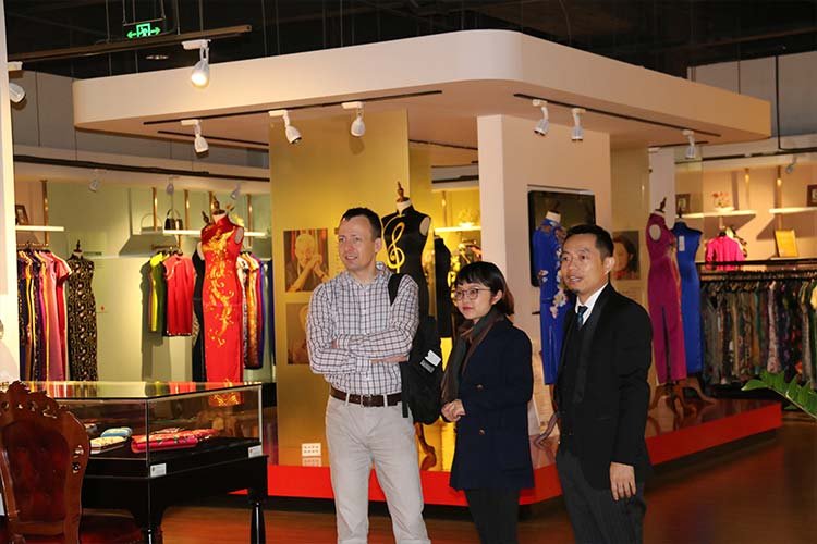 吳波博士帶領倫敦中央聖馬丁藝術與設計學院全球創新與商業總監Nick Wright參觀了校區內的中華旗袍館,Mr. Wright 被中華旗袍館內優雅精緻的中華服飾魅力吸引。Mr. Wright表示,中華旗袍的歷史與工藝令他大開眼界,同時他還表示回到英國後會更加努力學習中文,更好地瞭解中國時尚文化。