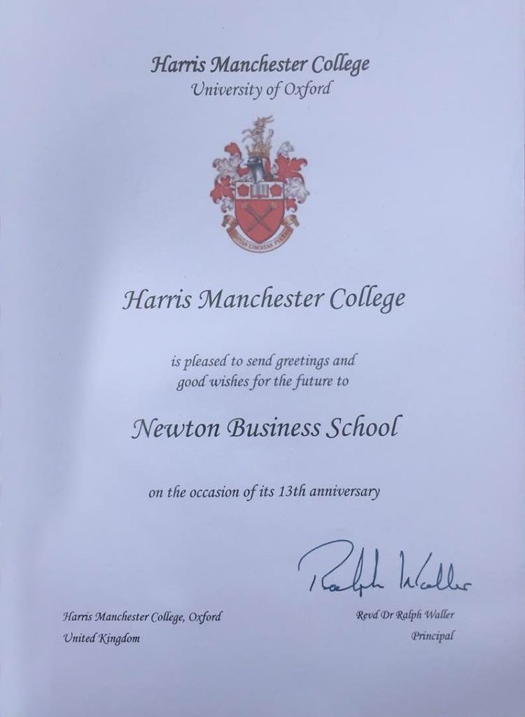 伊頓公學校長、牛津大學林肯學院院長Eric Anderson爵士為牛頓商學院全體成員題字祝賀