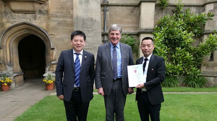 牛津大學執行校長拉爾夫?沃勒博士與牛頓商學院執行院長吳波博士、牛頓商學院-特聘教授喬文軍博士合影留念並親自為牛頓商學院成立13周年頒發祝賀函