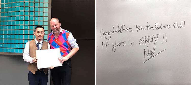 07 - 中央聖馬丁資深導師Hywel Davies在英國倫敦為牛頓商學院十四周年慶題詞,祝牛頓商學院NEWTON Business School為全球時尚界培養更多時尚精英人才。