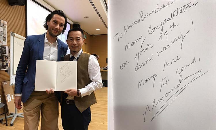 02 - 世界頂級鞋類設計大師Alexandru Adam在英國倫敦為牛頓商學院十四周年慶題詞,祝賀牛頓商學院NEWTON Business School 為全球時尚商界培養更多時尚精英人才。