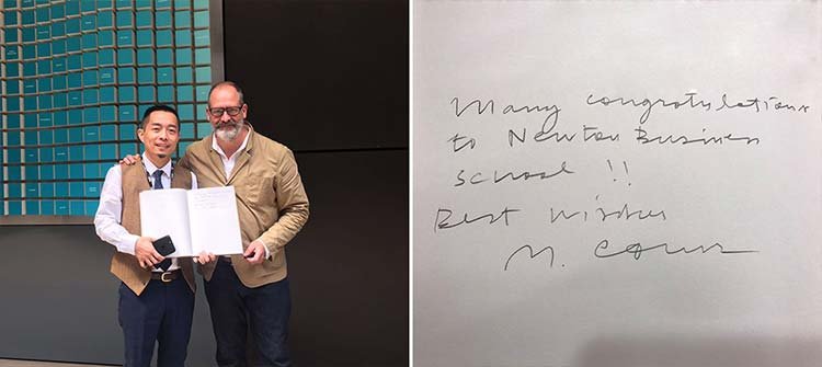 03 - 世界著名空間與奢侈產品設計大師Michael Corsar在英國倫敦為牛頓商學院十四周年慶題詞,祝賀牛頓商學院NEWTON Business School為亞洲時尚屆培養出眾多傑出人才。