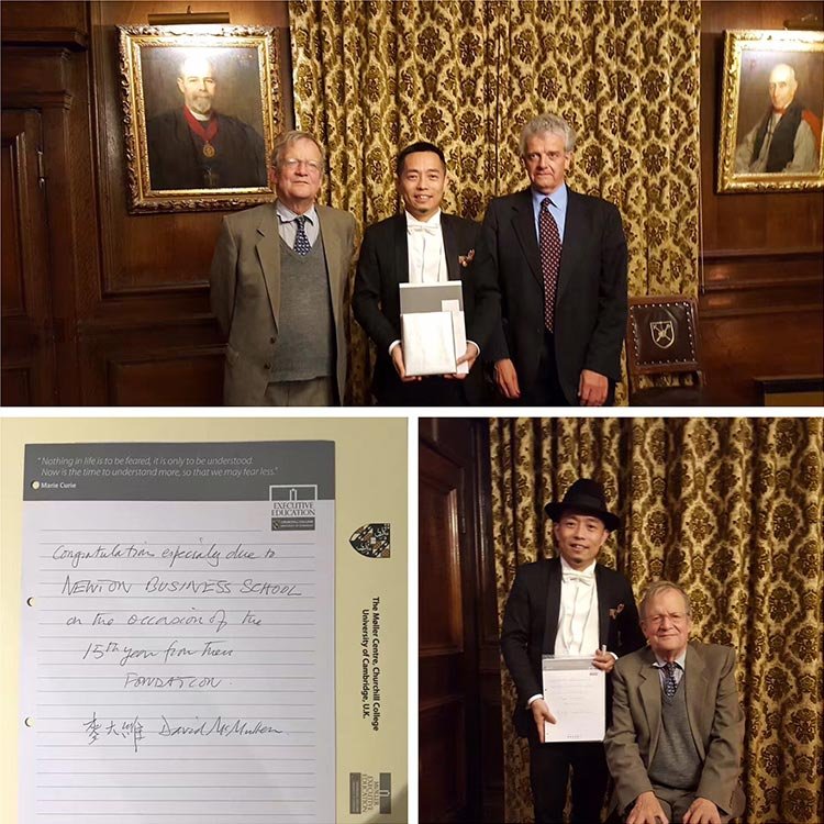 英國劍橋大學著名教授David Mcmullen提前在英國劍橋大學女王學院為“牛頓商學院成立十五周年”題詞祝賀