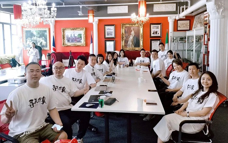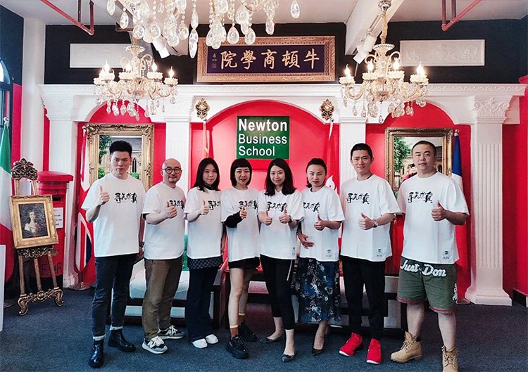 學員們身著華人青年品牌定制的牛頓商學院校訓“尋美求真”T恤衫合影留念