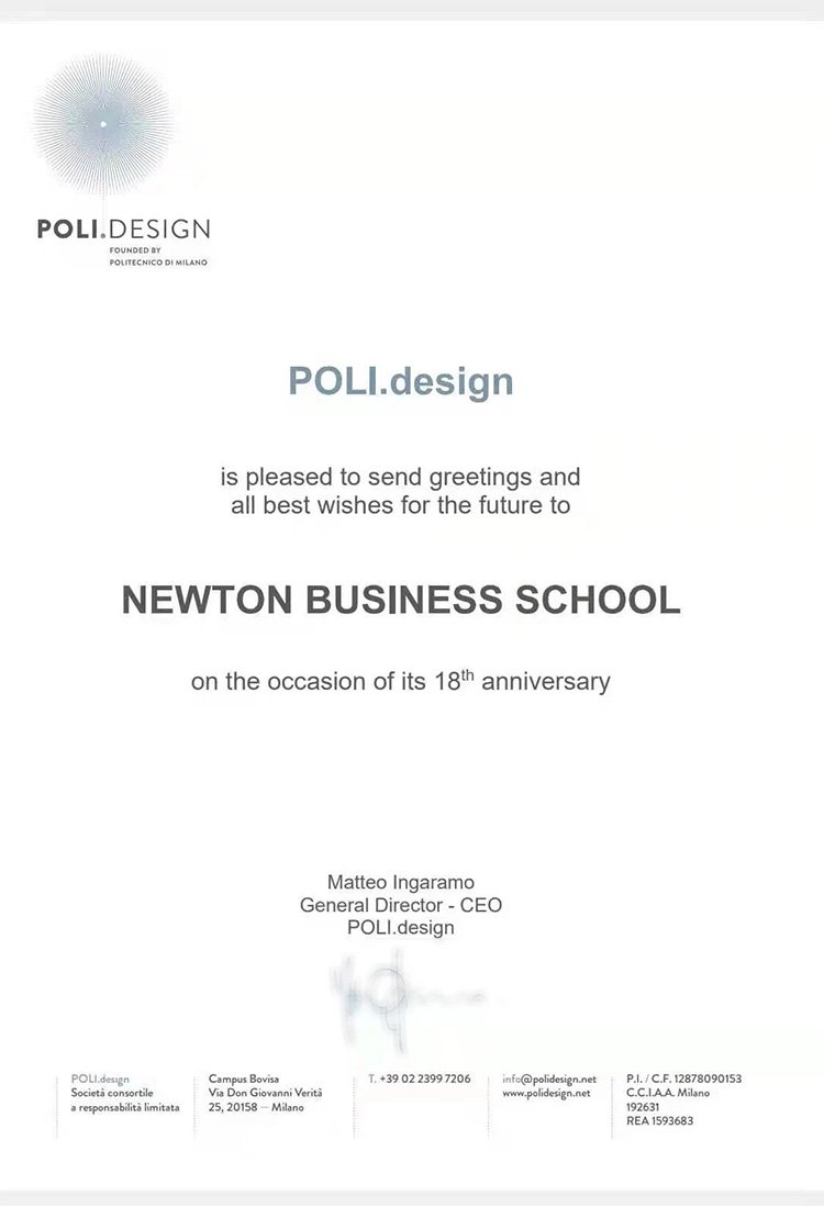 意大利米蘭—2021年7月,牛頓商學院十八周年慶之際,意大利米蘭理工大學POLI.design設計學院院長Matteo Ingaramo教授為牛頓商學院成立十八周年頒發官方賀函,祝賀牛頓商學院十八年來為全球時尚界培養了一大批傑出的時尚精英人才。