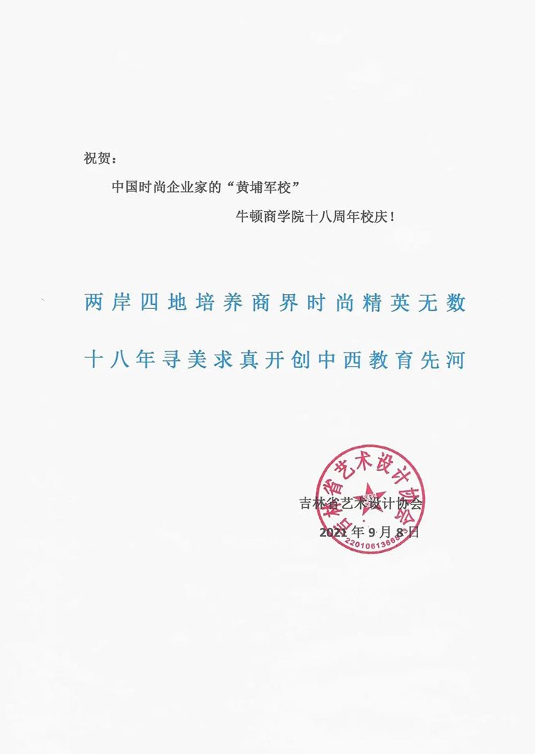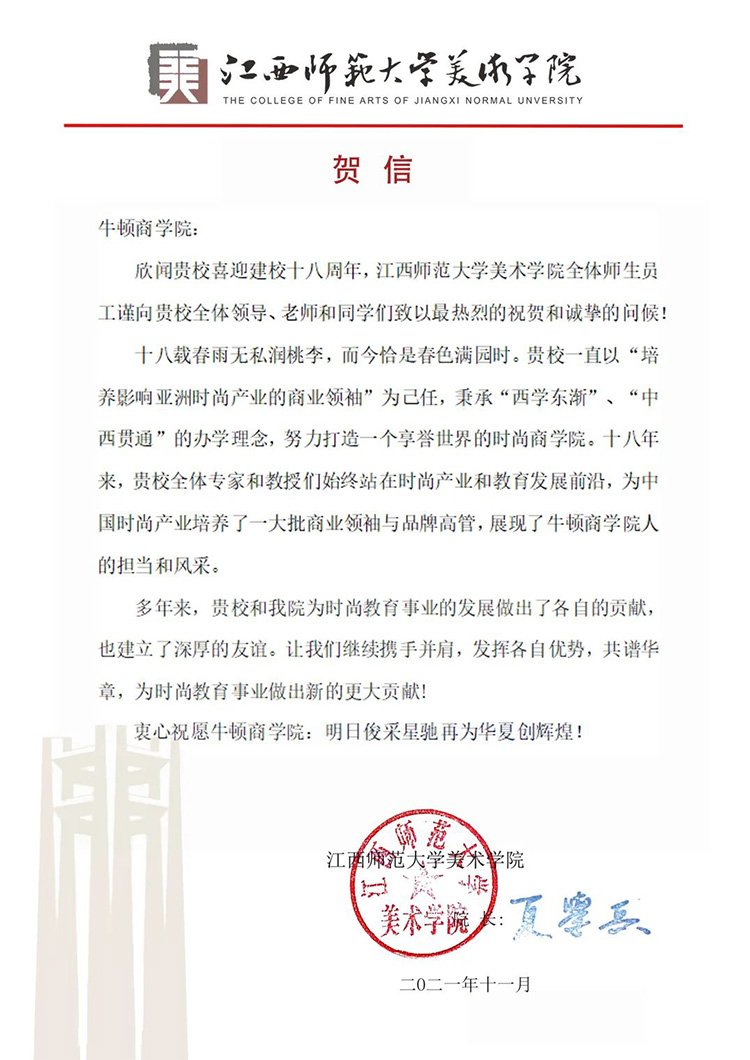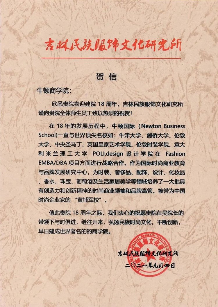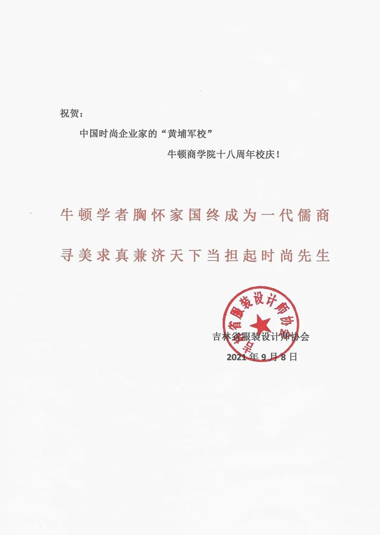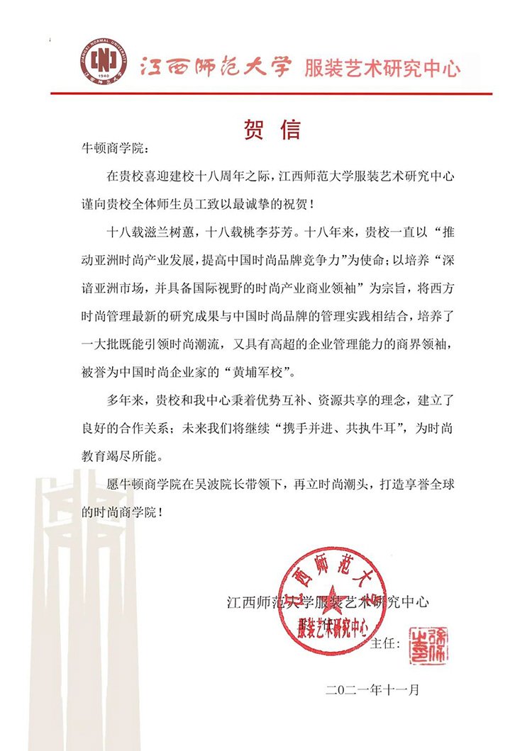 牛頓商學院院長吳波博士一直以來大力支持國內高校學科建設,多次前往高校做學術講座,是國內幾十所知名高校的兼職教授,牛頓商學院校友也多次被各大服裝高校、藝術院校聘為教授導師,同時牛頓商學院每年與高校聯合舉辦了幾十場影響深遠的前沿論壇。值此牛頓商學院成立十八周年之際,來自中國頂級院校、行業協會等紛紛發來賀函,慶賀牛頓商學院成立十八周年。