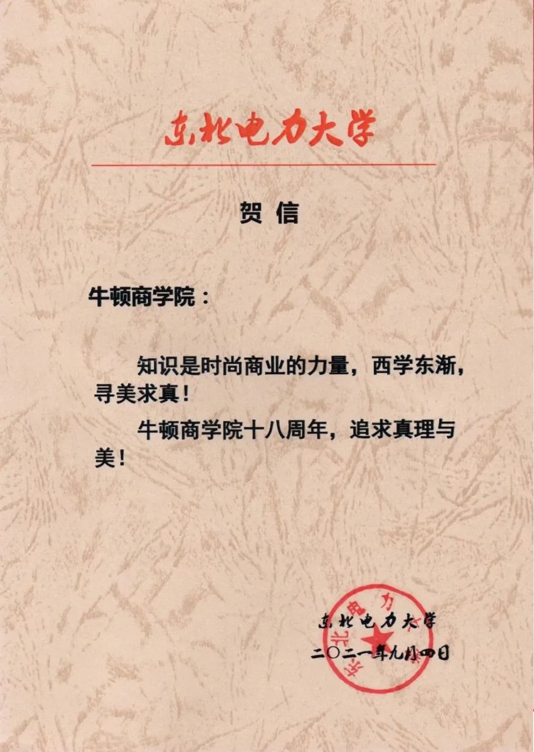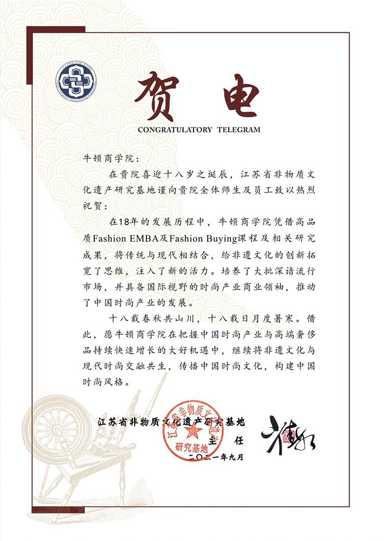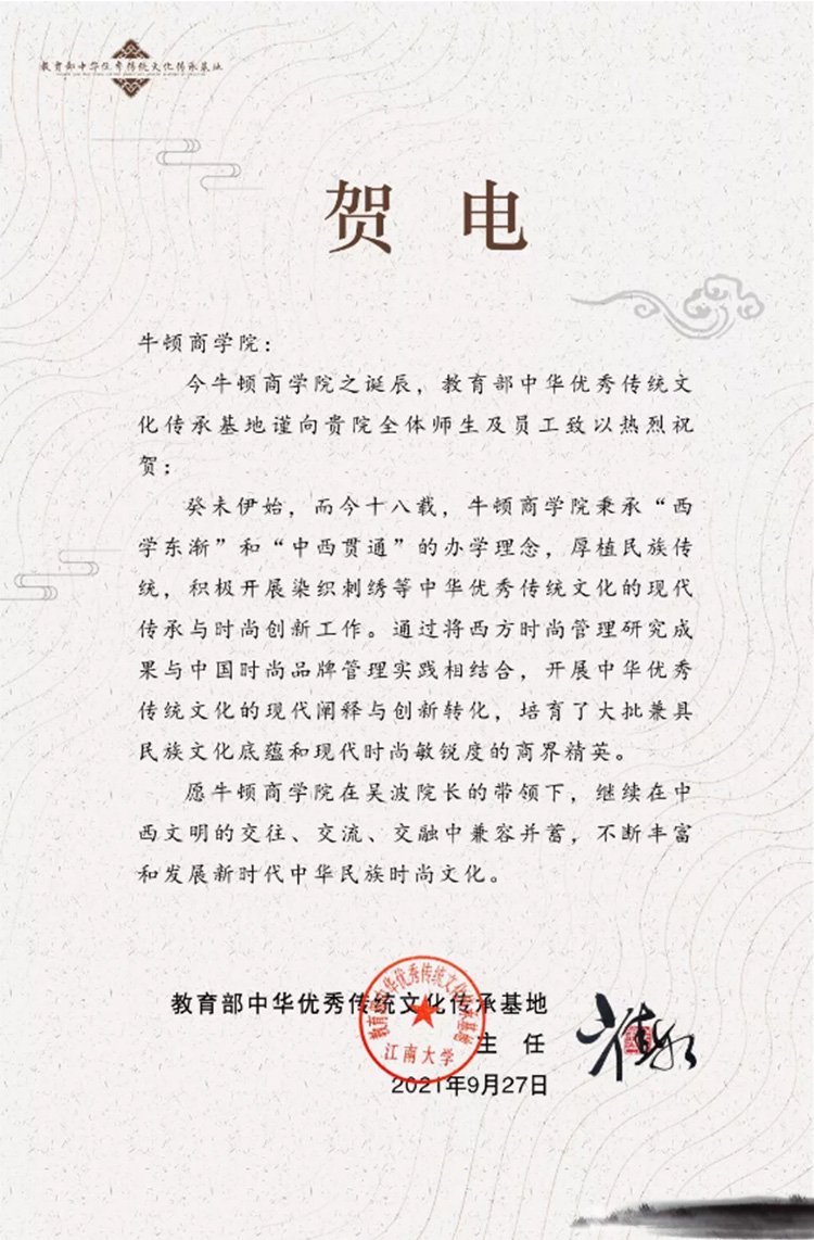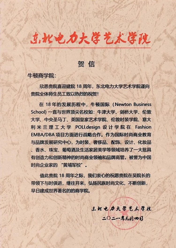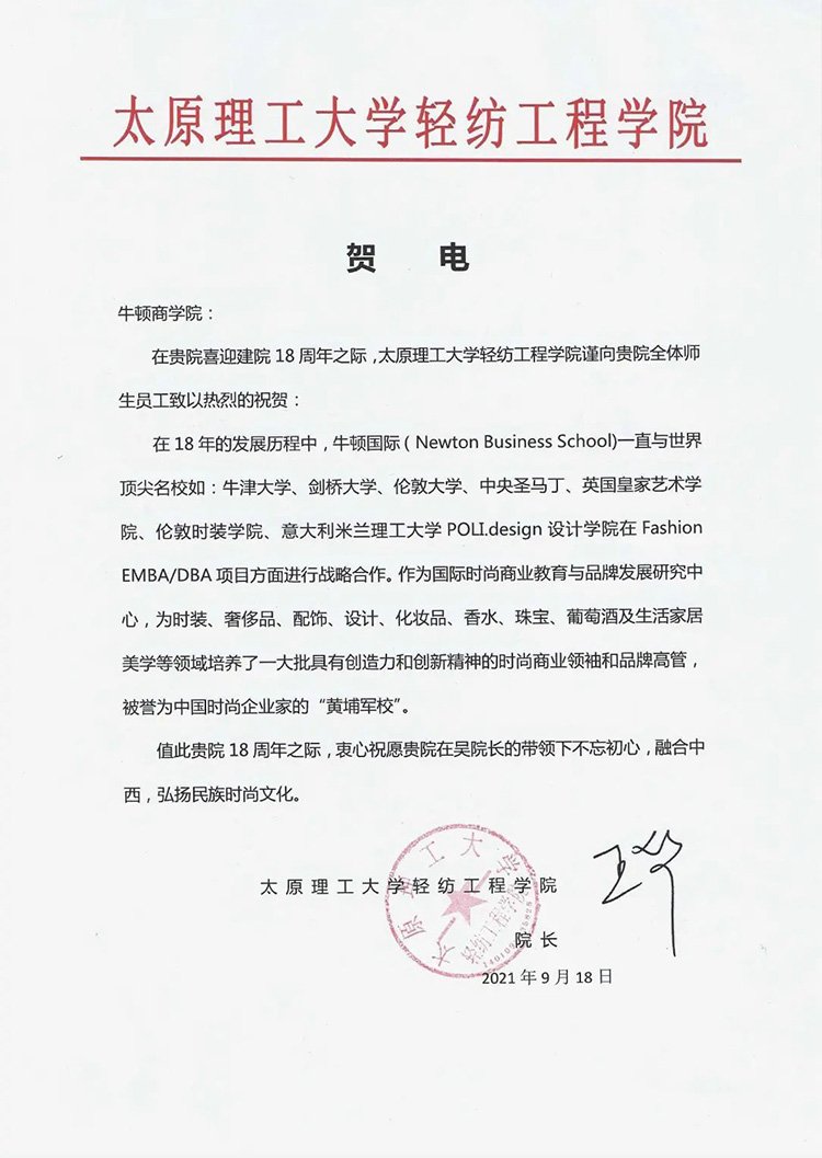 牛頓商學院院長吳波博士一直以來大力支持國內高校學科建設,多次前往高校做學術講座,是國內幾十所知名高校的兼職教授,牛頓商學院校友也多次被各大服裝高校、藝術院校聘為教授導師,同時牛頓商學院每年與高校聯合舉辦了幾十場影響深遠的前沿論壇。值此牛頓商學院成立十八周年之際,來自中國頂級院校、行業協會等紛紛發來賀函,慶賀牛頓商學院成立十八周年。