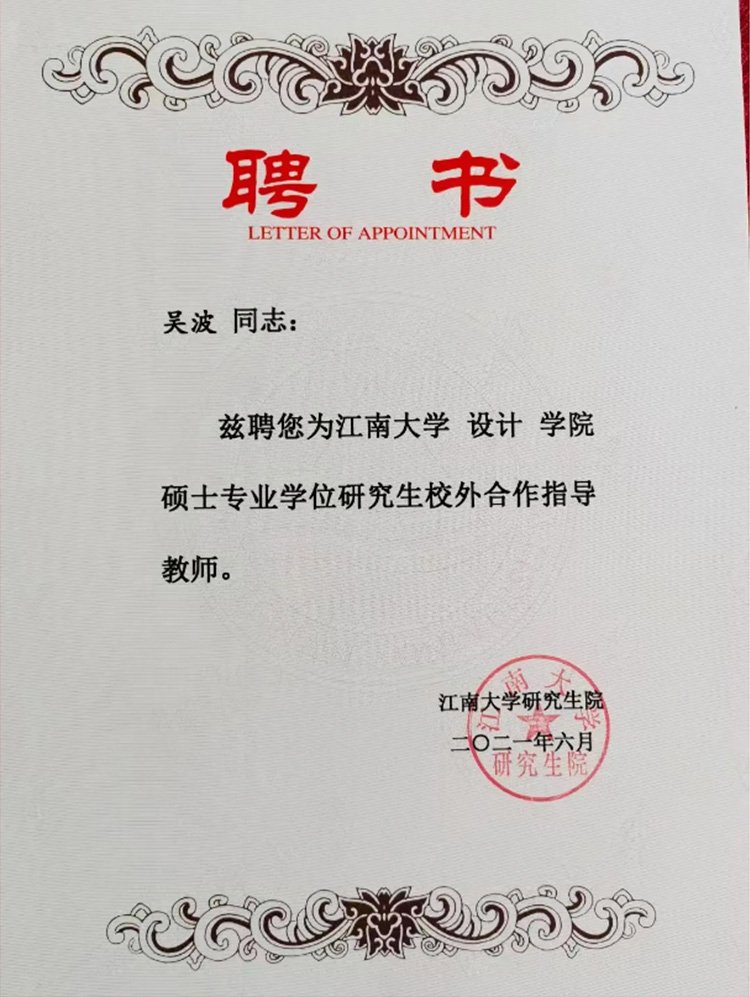 牛頓商學院院長吳波博士被江南大學聘任為碩士專業學位導師