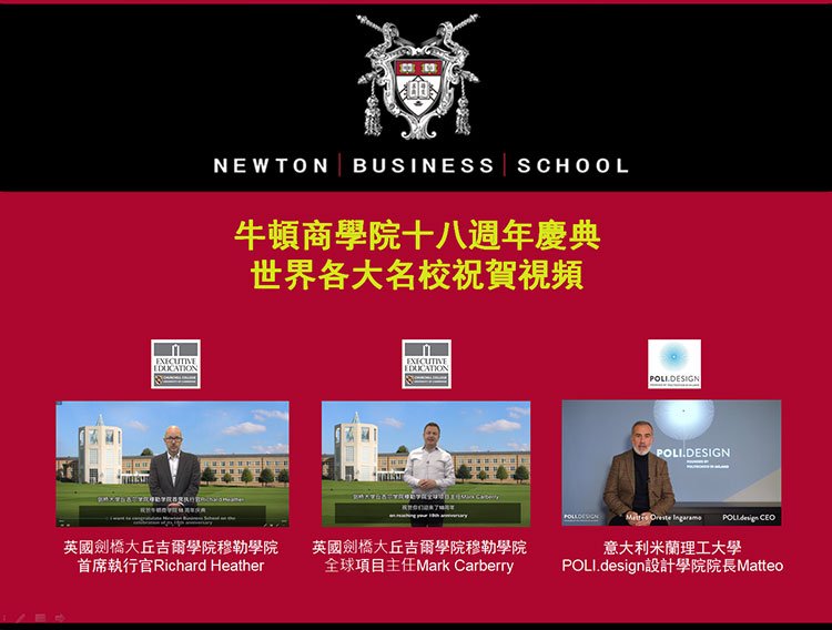 英國劍橋大學邱吉爾學院穆勒學院首席執行官Richard、全球專案主任Mark;意大利米蘭理工大學設計學院院長Matteo視頻祝賀牛頓商學院18周年