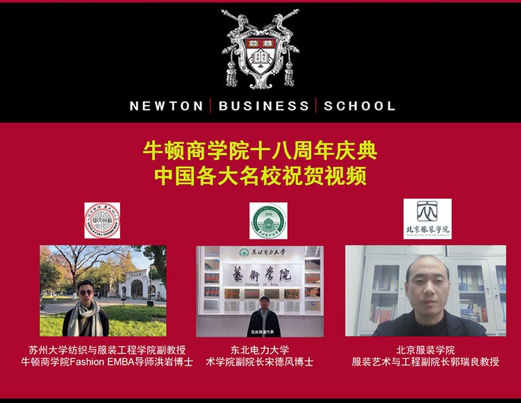 蘇州大學紡織與服裝工程學院副教授洪岩博士;東北電力大學術學院宋德風院長;北京服裝學院服裝藝術與工程副院長郭瑞良教授視頻祝賀牛頓商學院18周年