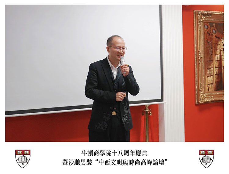“大家好,很高興這次能夠冠名贊助牛頓商學院周年慶典和中西文明與時尚論壇,作為一名企業家、作為牛頓商學院的校友,我在這裡收穫了很多,這次冠名贊助也算是獻給牛頓商學院十八周年的賀禮。同時我們沙馳公司也定制了牛頓商學院Fashion EMBA課程,讓整個公司更專業化地運營品牌,我的目的就是要打造中國獨立運作的奢侈品牌。我相信未來一定可以做到。最後祝牛頓商學院越辦越好。”