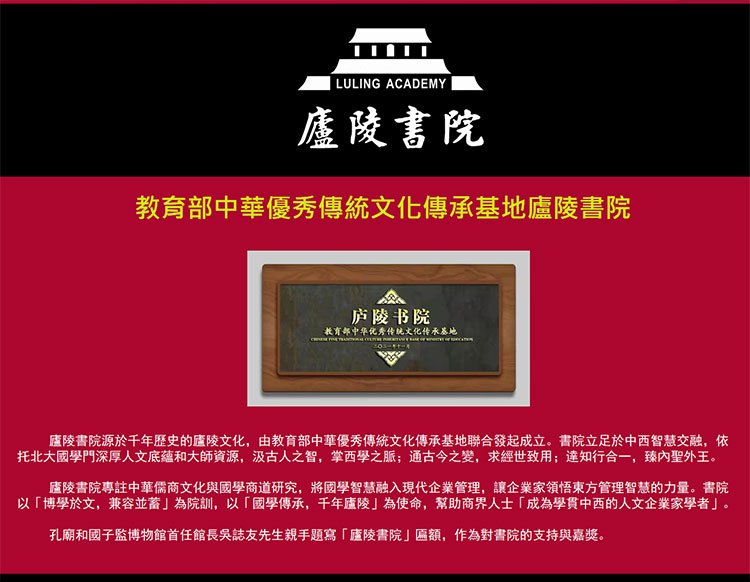 廬陵書院是由教育部中華優秀傳統文化傳承基地聯合發起成立,本著將傳統國學和現代產業結合的初衷,成立的一所書院,書院將會把國學、儒學、中庸等傳統優秀文化,和現代管理、傳播中結合,貫徹到應用中。幫助商界人士“成為學貫中西的人文企業家學者”。