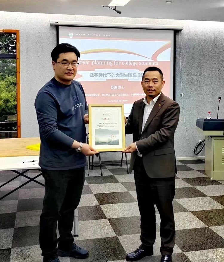 吴波博士被中国美术学聘为大学生就业导师,中国美术学院创业学院办公室主任许鲁挺为吴波博士颁发聘书。