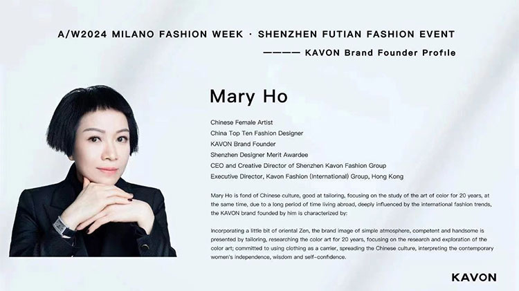 全球四大頂級時裝周之一的米蘭時裝周於2024年2月20日至26日正式開啟,在本次米蘭時裝周舉辦期間,香港高商-中歐時尚研究院優秀校友Mary Ho創立的KAVON卡汶品牌發布秀在米蘭王宮舉行,向世界展示中國龐大的時尚市場規模和深厚的創意實力。詮釋中國古代文明與當代東方女性深厚的文化內涵,展現當代東方女性的智慧、文化自信。