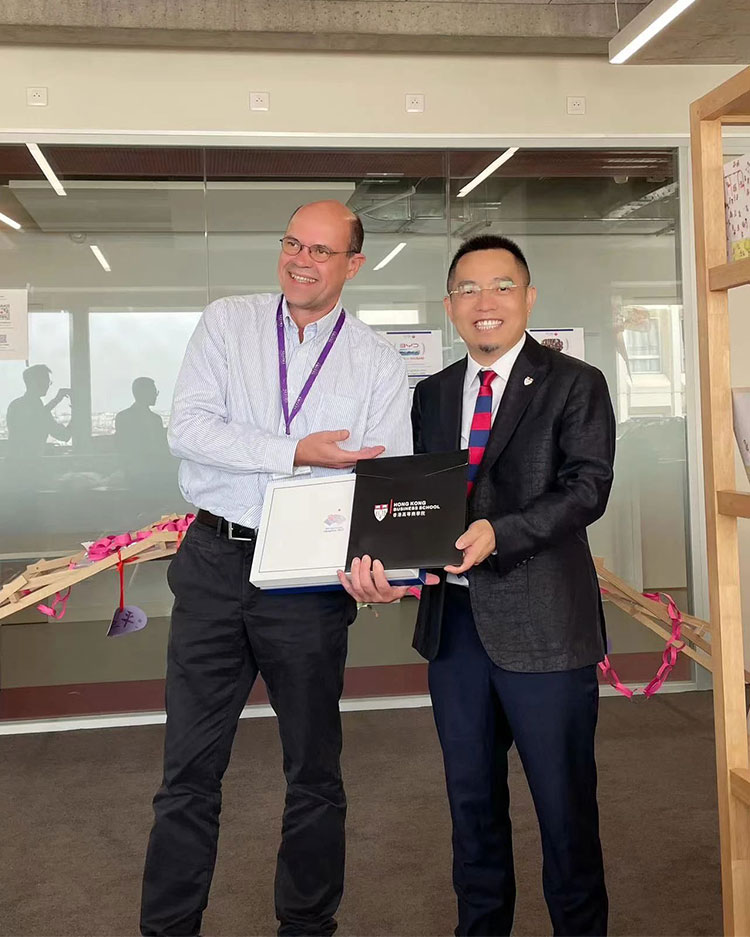 香港高等商學院院長吳波教授與法國諾歐商學院行政副院長 Frédéric Droguet 代表兩院贈送禮物