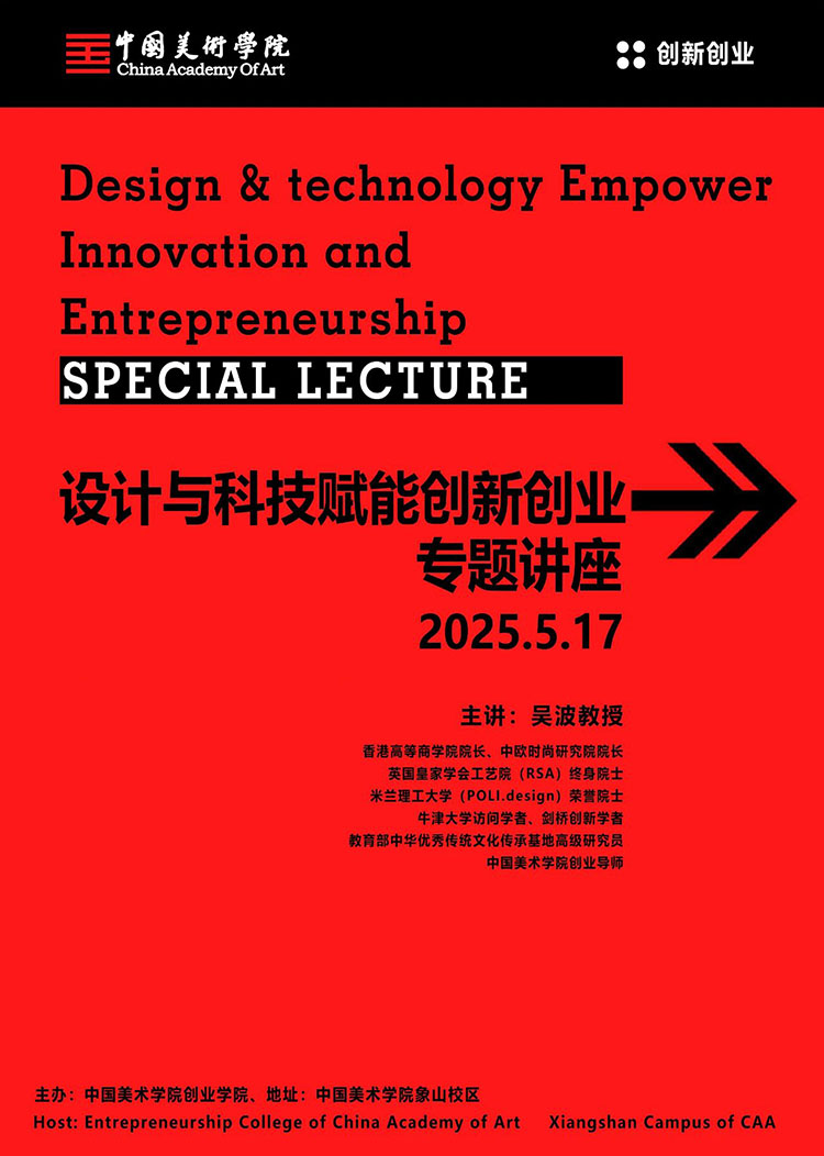 2025年5月17日,香港高等商學院院長、中歐時尚研究院院長吳波教授應中國美術學院之邀,以 "Design+AI Innovation—設計與科技賦能創新創業,通過文化、藝術、科技重新設計品牌" 為主題,為中國美術學院師生們帶來了一場精彩絕倫的學術講座。此次講座不僅是一次思想的碰撞,更是時尚與藝術、科技深度融合的生動詮釋。