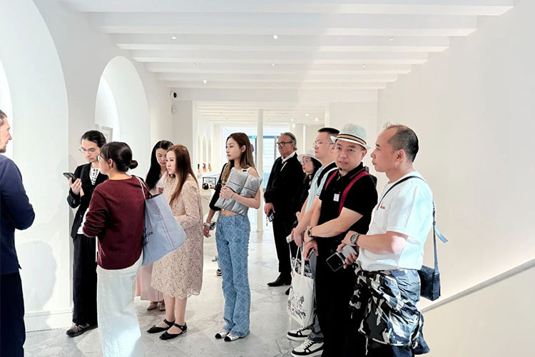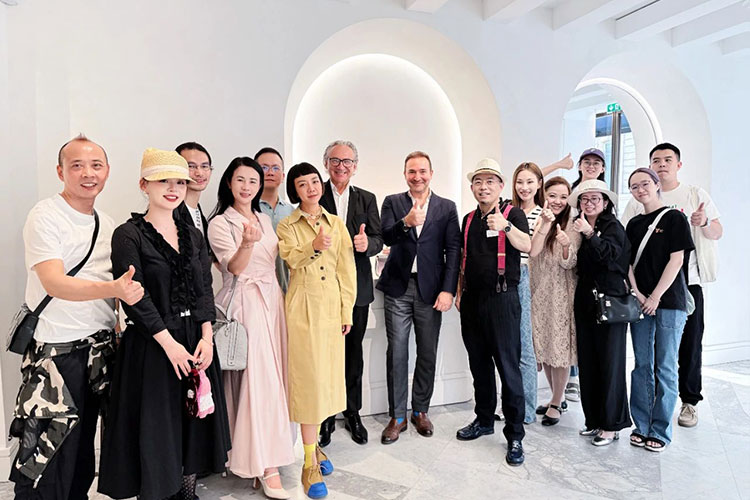 法國巴黎—2025年7月9日,香港高等商學院-中歐時尚研究院117期「中法時尚管理DBA班」的學員們在法國諾歐商學院導師菲利普教授的帶領下參訪頂級巴黎奢侈品工坊Joseph Duclos巴黎旗艦店。