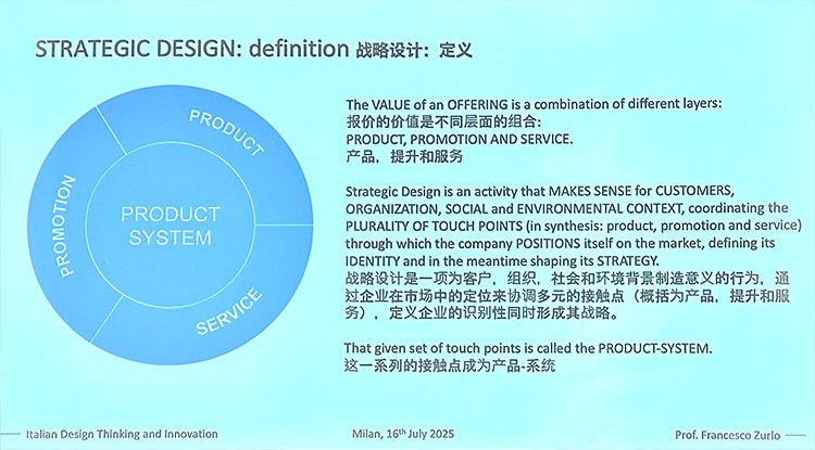 Franceso Zurlo 教授為香港高商118期中意時尚管理DBA班「米蘭模組」講授「意大利設計思維與創新」,Zurlo 教授在課堂中講到,戰略設計的目的不是要去創新一個產品,而是要去做一個創新的產品系統。也就是說要在你的產品系統後面明確一個非常鮮明的概念,這個概念就是你在市場行銷,以及傳播中所要講述的故事,而這個故事我們就可以把他看作是這個企業的戰略。