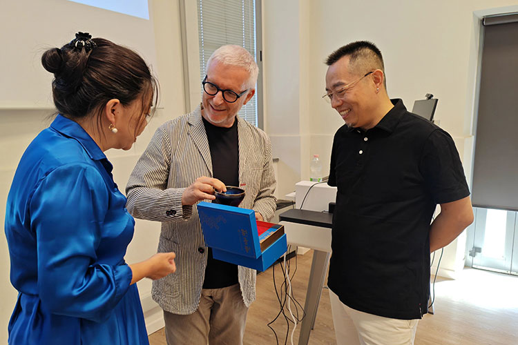 香港高等商學院院長吳波教授向意大利米蘭理工大學設計學院院長Francesco Zurlo教授贈送禮物,見證中意兩院的“雙向奔赴”